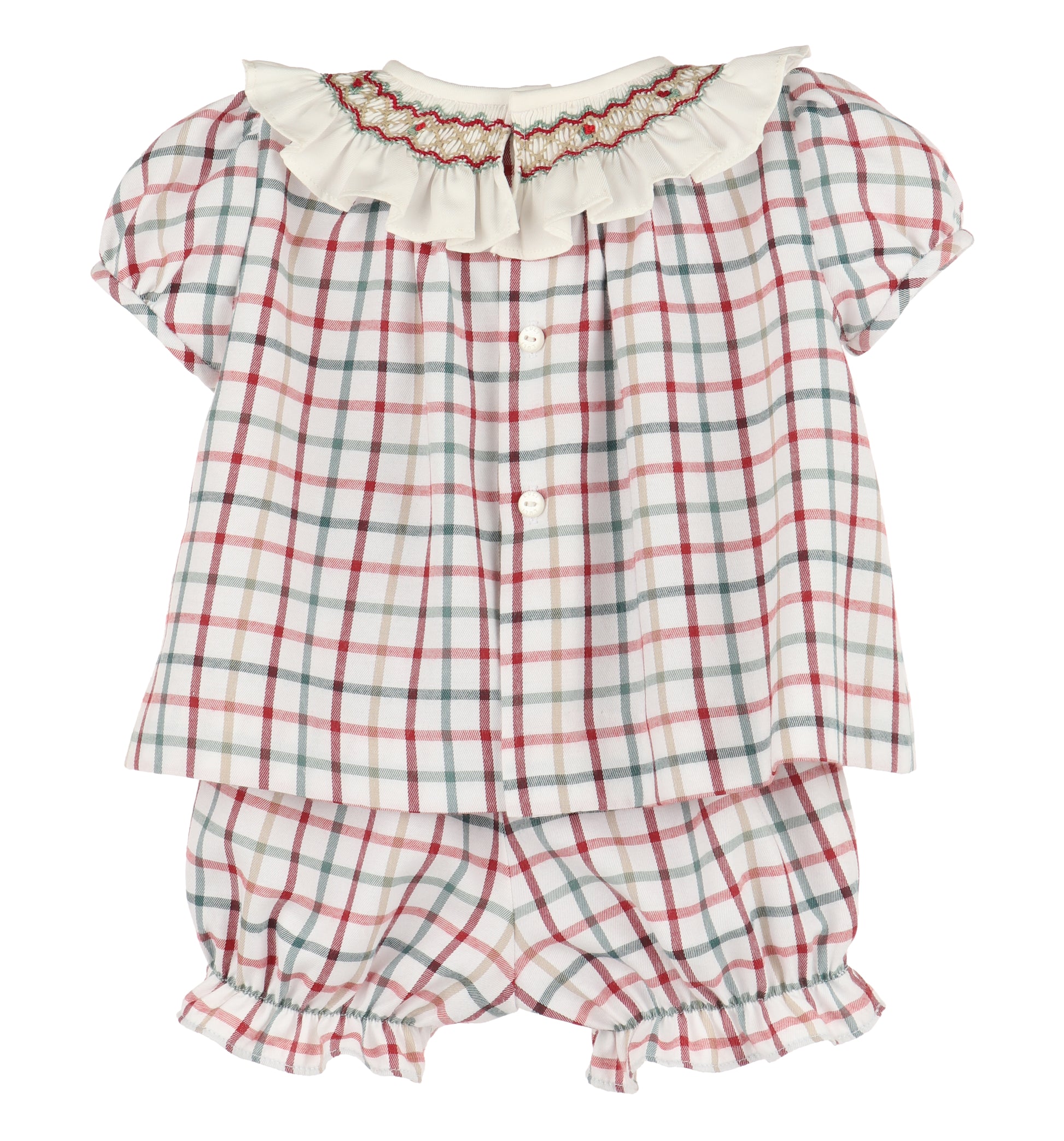 This charming smock girl set brings timeless style with a classic tattersall plaid pattern featuring a crisp white base accented with rich green and red tones. The matching dress showcases delicate lace detailing that adds a touch of elegance and vintage-inspired charm. Perfect for special occasions or everyday wear, this coordinated set combines traditional patterns with sweet, feminine touches that any little one will love. A wardrobe essential that's both classic and playfully sophisticated.